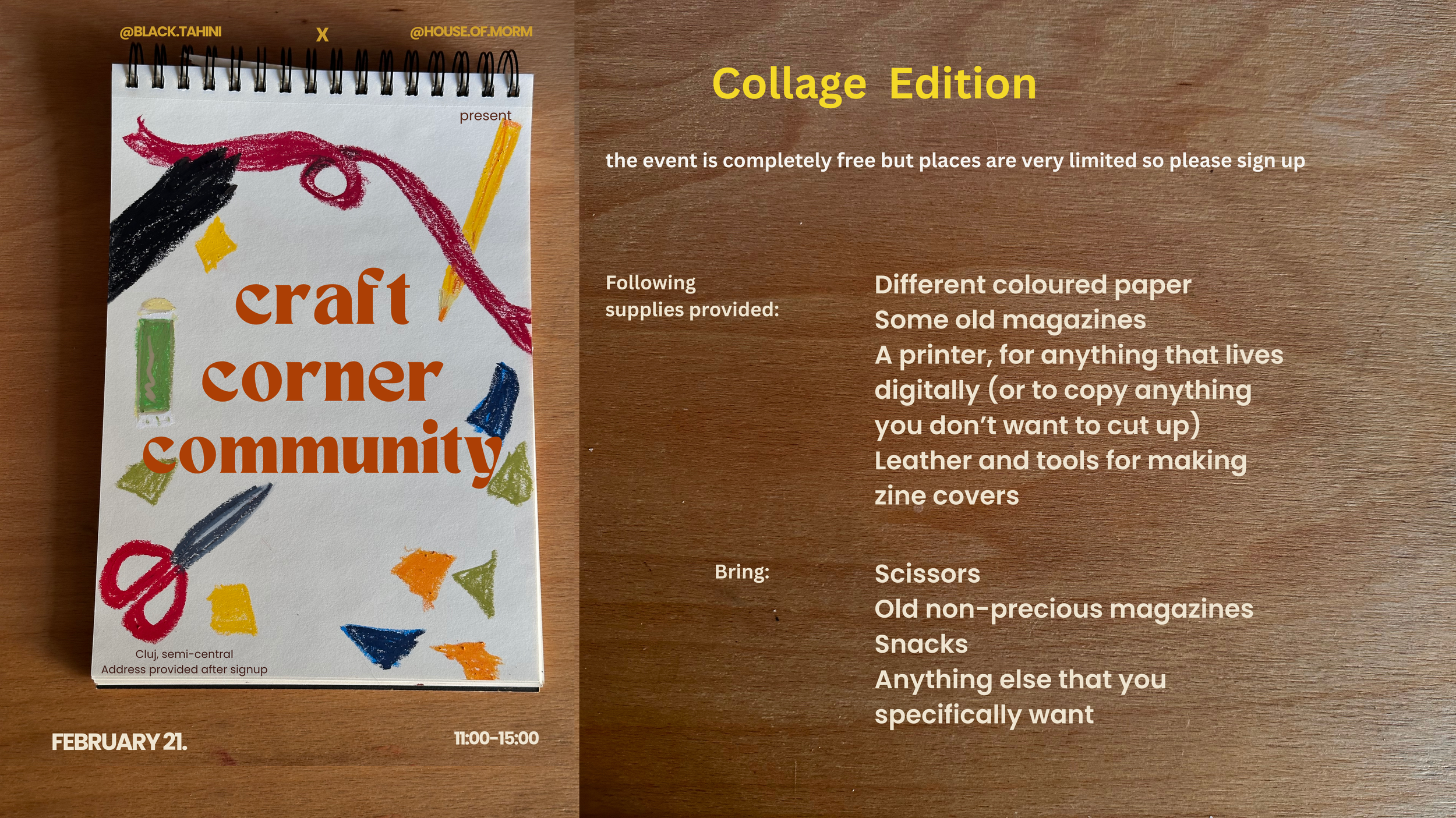 Our next event is a cosy crafting corner. We’re going to collage together, create vision boards, little zines, postcards and art pieces, eat delicious snacks and share stories and techniques. This event is co-conspired by the wonderful Mara Brehar (@black.tahini).